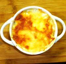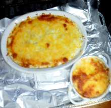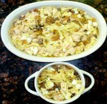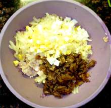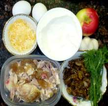 Жареные грибы с луком, яблоко, горчица. Остатки жареной (варёной) курицы, жареные грибы с луком, тёртое яблоко, рубленное яйцо смешиваются в миске, добавляется соль и перец. Подготовленная масса выкладывается в формы для запекания, заливается сметанным соусом (сметана + разведенная в воде мука + чеснок + горчица + укроп), посыпается сыром и запекается 15-20 минут при 200 С.