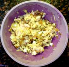 | Жареные грибы с луком, яблоко, горчица. | Остатки жареной (варёной) курицы, жареные грибы с луком, тёртое яблоко, рубленное яйцо смешиваются в миске, добавляется соль и перец. Подготовленная масса выкладывается в формы для запекания, заливается сметанным соусом (сметана + разведенная в воде мука + чеснок + горчица + укроп), посыпается сыром и запекается 15-20 минут при 200 С. |