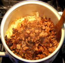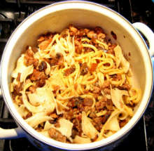 В кастрюлю с маслом выложить лапшу и куриный фарш с грибами.