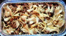 Куриный фарш, жареные грибы с луком Отваренная лапша смешивается с обжаренным куриным фаршем, жареными грибами с луком, заливается омлетной смесью и запекается